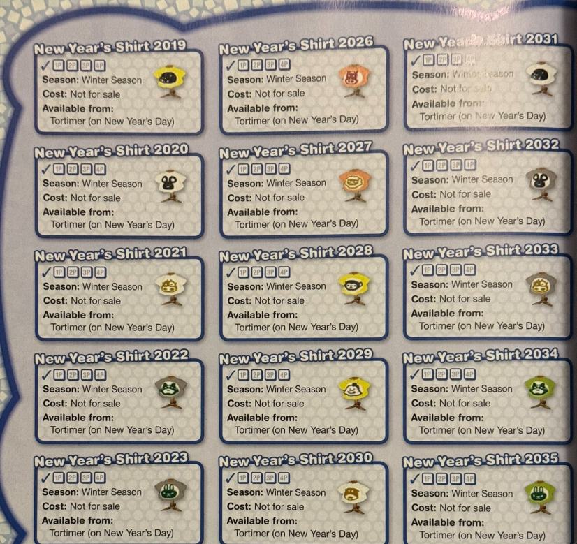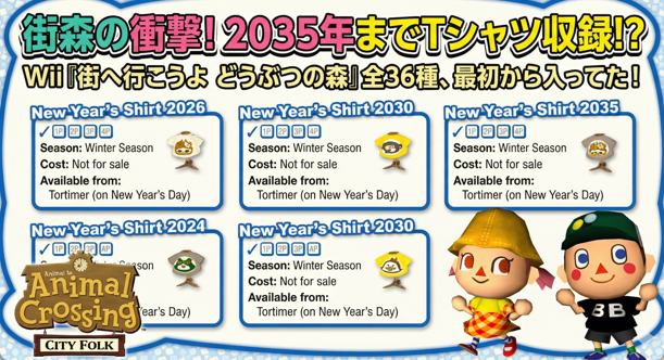 『街へいこうよどうぶつの森』では、ニューイヤーTシャツ(年越しシャツ/干支Tシャツ)が2035年分までデザインがゲーム内に完全に収録されていることが注目を集めています。