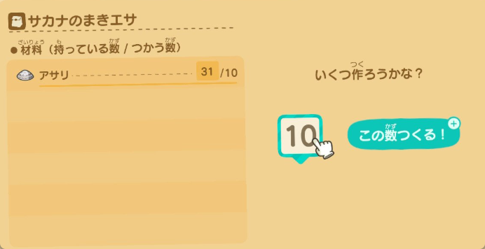 まとめてクラフトできるからエサ作りも楽になったよね。