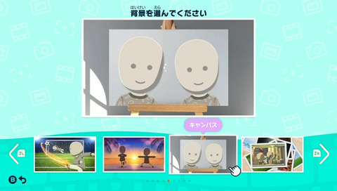 背景とMiiを選び、構図を決めて写真を撮影できます。